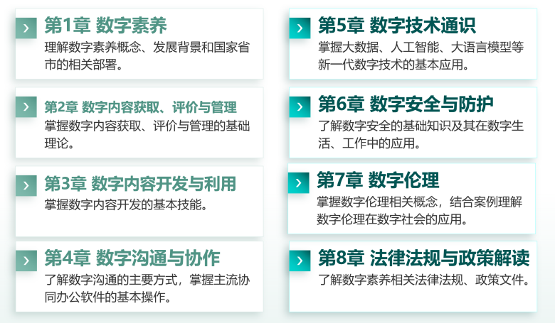 教材简介:本书贯彻落实中央《提升全民数字素养与技能行动纲要》等文件精神,由全国高等学校计算机教育研究会指导,并组织数字化能力水平认证(DCLC)专家委员会、执行委员会编写,遵循《数字素养与技能认证》团体标准、数字化能力水平认证数字素养认证考试大纲,借鉴欧盟DigComp公民数字素养概念参考模型、联合国教科文组织《数字素养全球框架》,坚持“产教融合、学以致用”理念,总结多年、多层次、多行业数字人才培养经验,形成完备的数字素养与技能知识体系,适用于大专院校数字素养通识教育、新质生产力人才培养、数字领导力基础理论学习、个人数字素养与技能提升等用途。全书共分为8章: